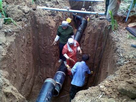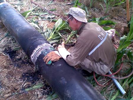 工地上,轟隆隆的挖掘機一刻不停地加緊作業,龐大的壓路機穿梭來往,場外的施工人員忙著鋼管焊接、溝槽回填……各項工作如火如荼、緊張有序地進行著。此時雖已避過高溫時段,但酷熱煩悶的高溫天氣還是讓人難以忍受,站在那里沒幾分鐘,我便開始渾身冒汗了。望向旁邊的施工人員,烈日的暴曬和電焊的灼熱早已使他們衣衫浸透、汗流浹背,而他們卻渾然不覺,臉上滿是認真專注的神情。此時此刻,我才真正體會到他們嘴中所說的“晴天一身汗,雨天一身泥”的含義,這是他們工作狀態的真實寫照。看著他們正全情投入地忘我工作著,便不好意思上前打擾,開始獨自向前走去。